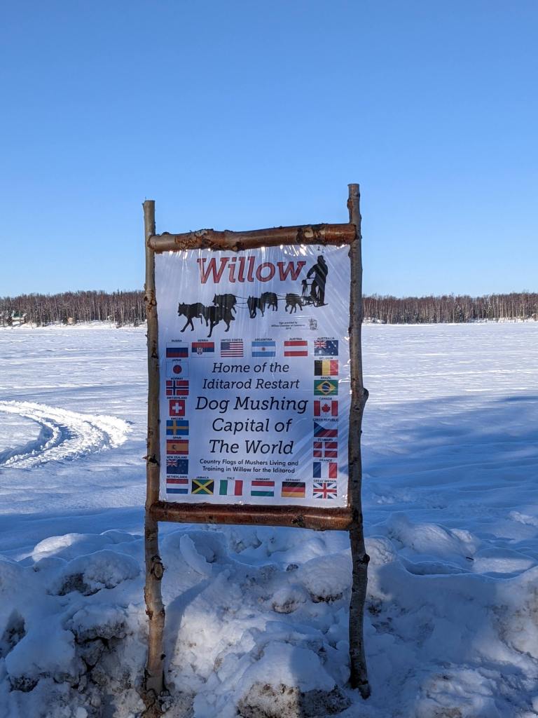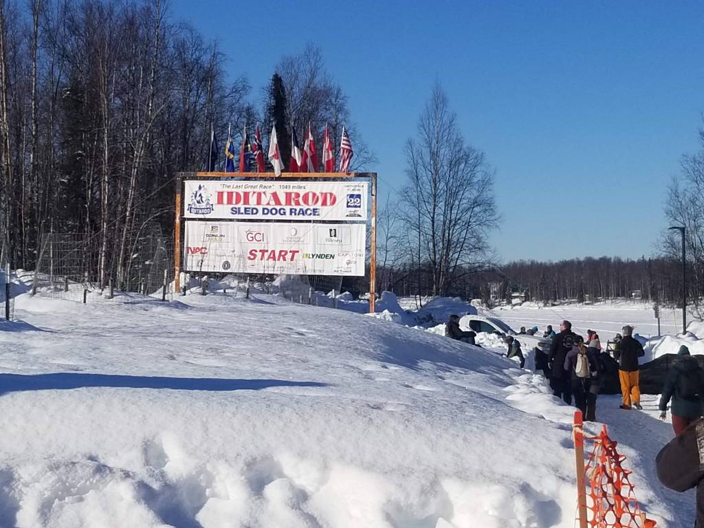 With the Ceremonial Start behind us, we decided to head north to catch the official start in Willow, AK. Willow is about an hour drive from Anchorage. Because of the storms, it may have taken us a bit longer. We rented an adorable cabin on Big Lake. This was about 30 minutes from Willow. Once at the race start, we again picked out some prime real estate for spectating. Conveniently located close to a porta-potty in the middle of Willow Lake.