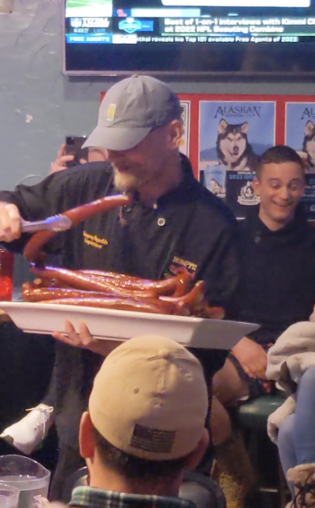 We stayed at the Hilton Anchorage, which proved to be an excellent location, but for reasons I’ll save for another day, I have nothing good to say about the hotel, except the doorman who was just lovely and gave us an excellent food recommendation. For two weeks prior to the Iditarod another festival takes place in downtown Anchorage. The festival is called Fur Rendezvous or Fur Rondy for short. These two weeks are packed with events like races, hockey games, ice bowling, live music, the ever popular Running of the Reindeer, native events and one event we accidentally stumbled upon, sausage eating contest.